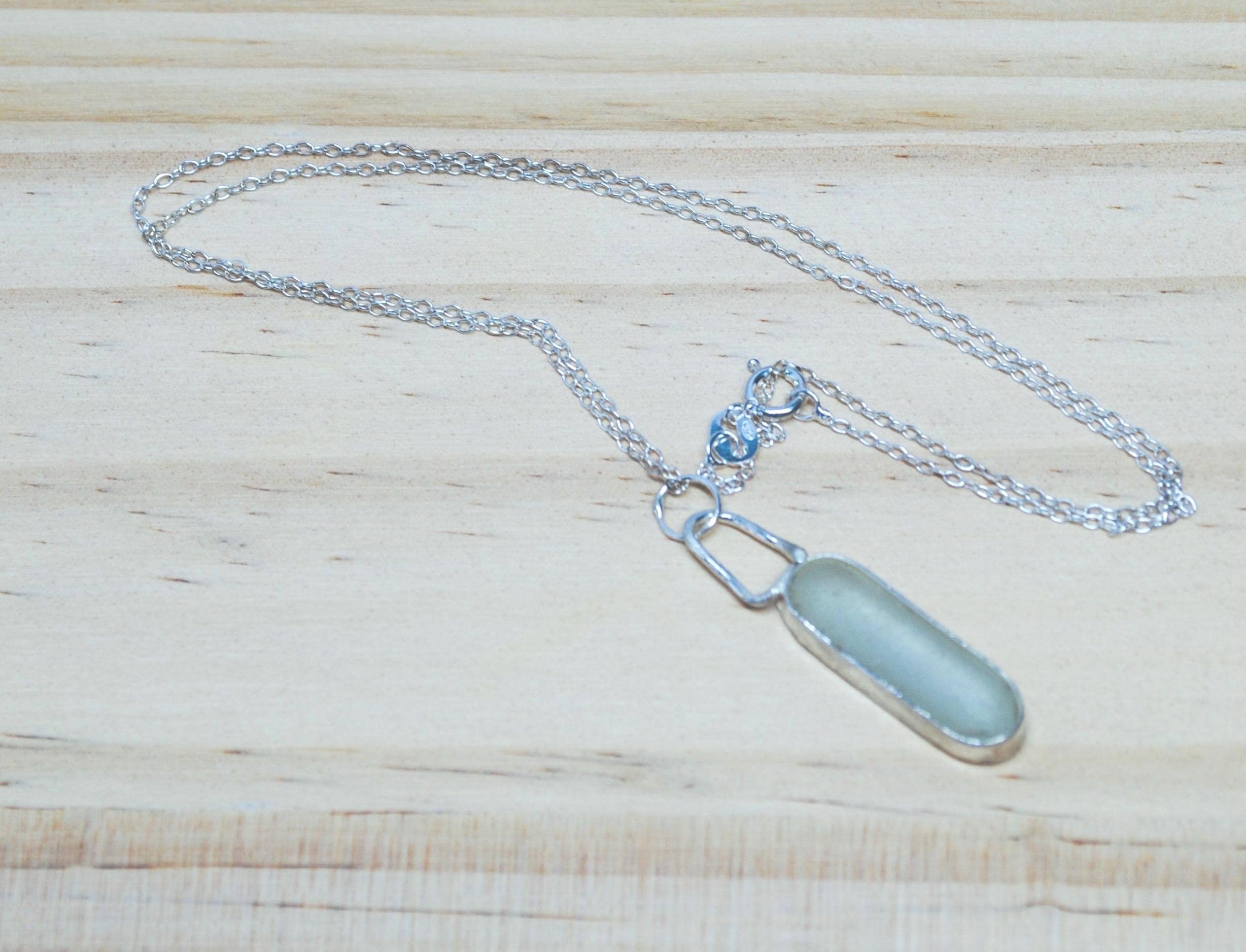 This stunning piece of pale sea glass has been carefully set in sterling silver and hangs beautifully from a delicate sterling silver chain.