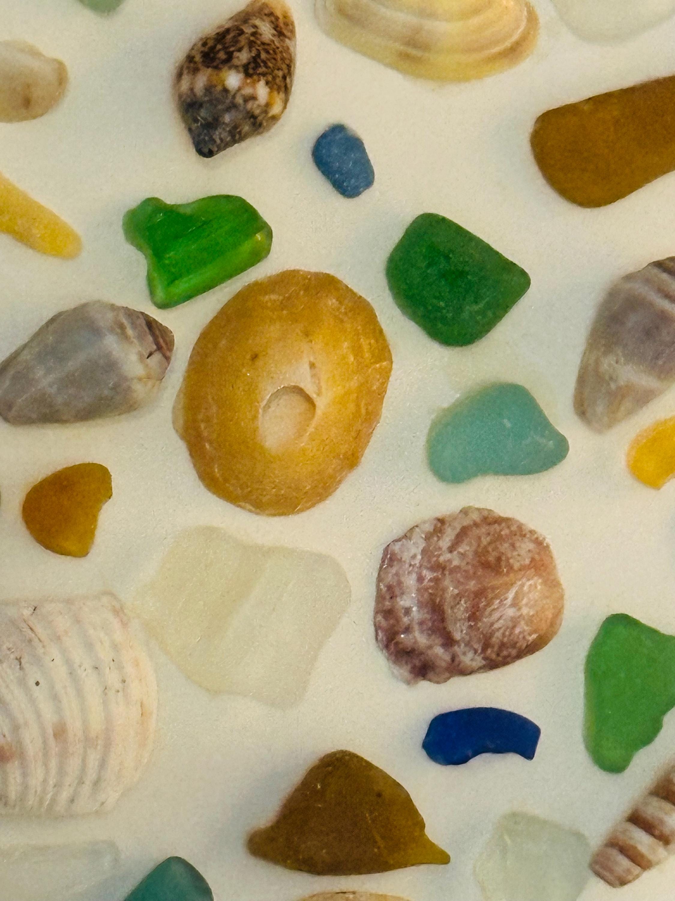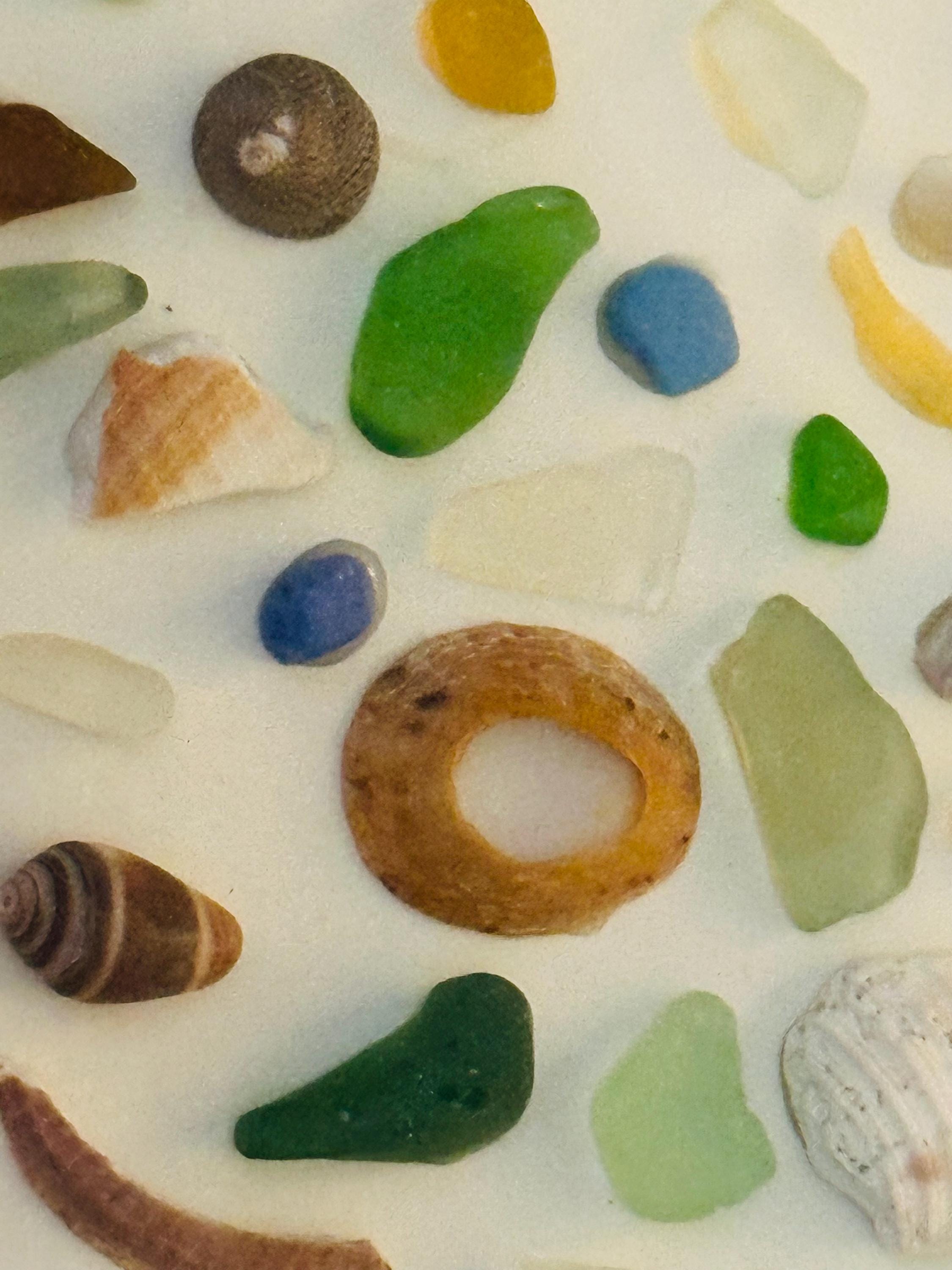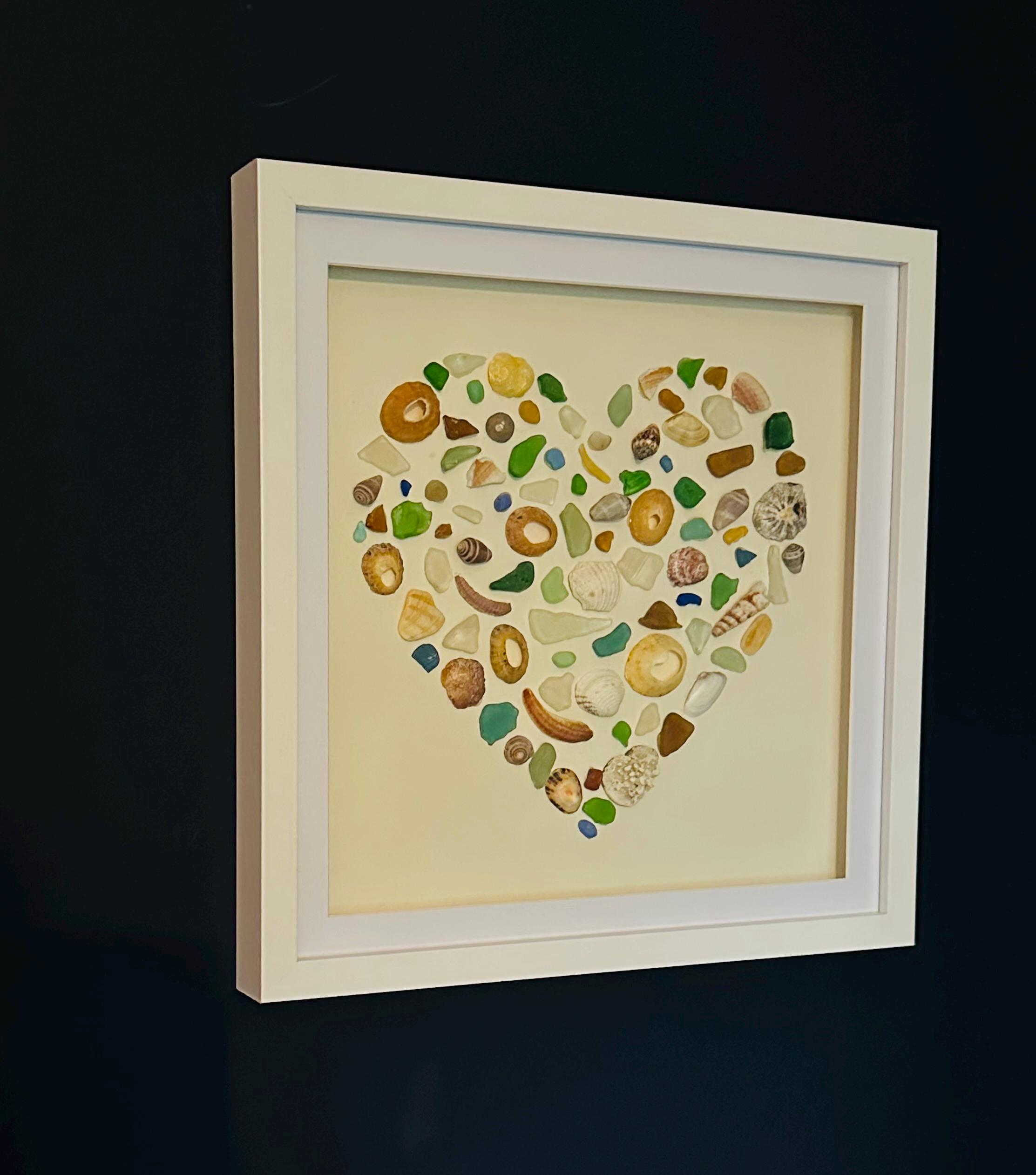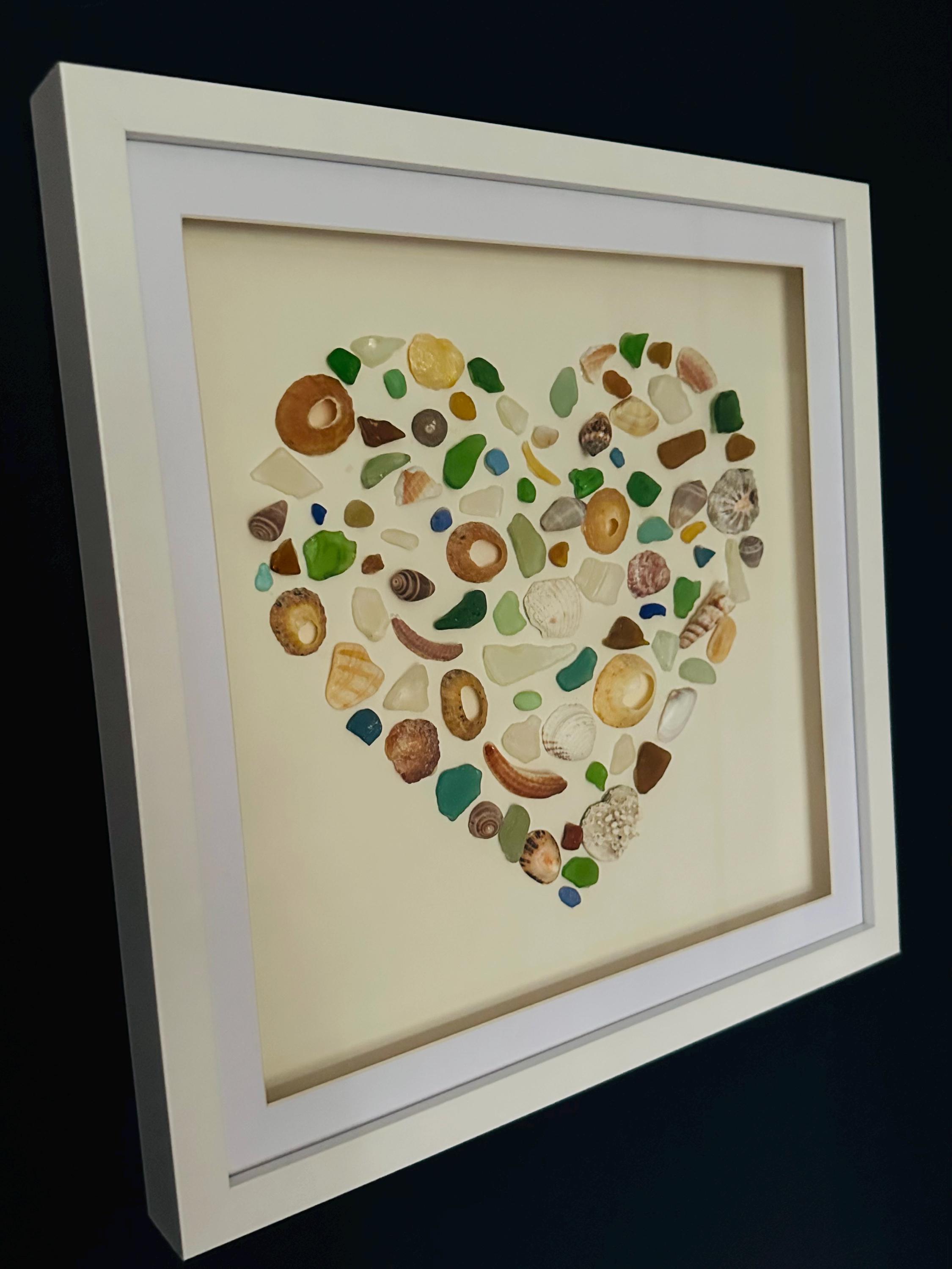 I created this piece using shells and sea glass I collected from the beautiful beaches of Tarifa, where the Atlantic meets the Mediterranean. Every fragment has been shaped by the sea over the time, and I've arranged them into a design that reflects the calm, wild beauty of the coast, in a heart shape which captures the loving and laid-back vibe in Tarifa.
