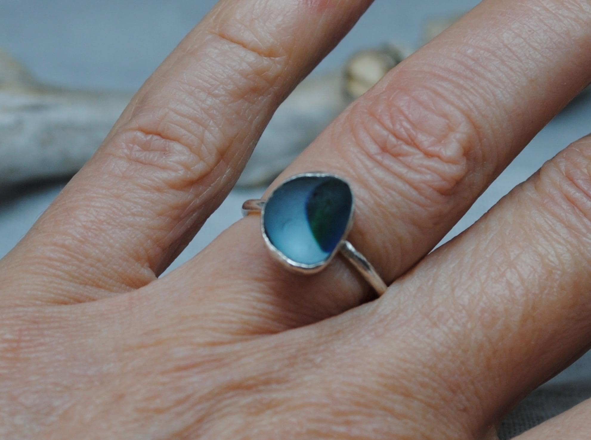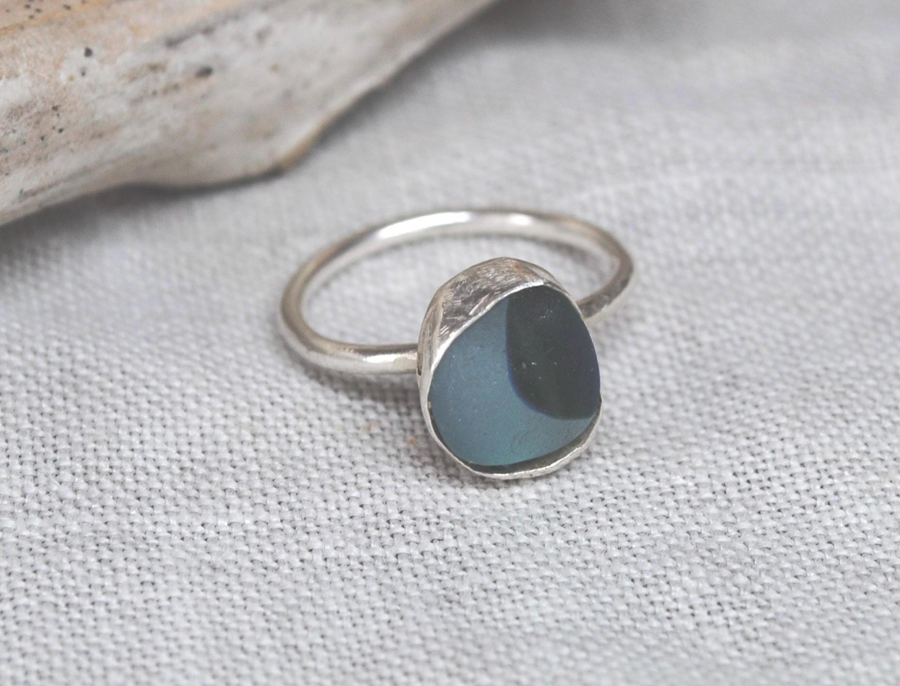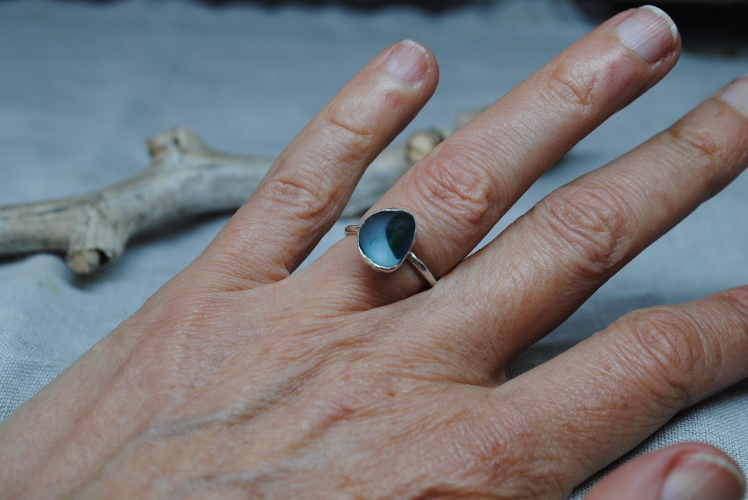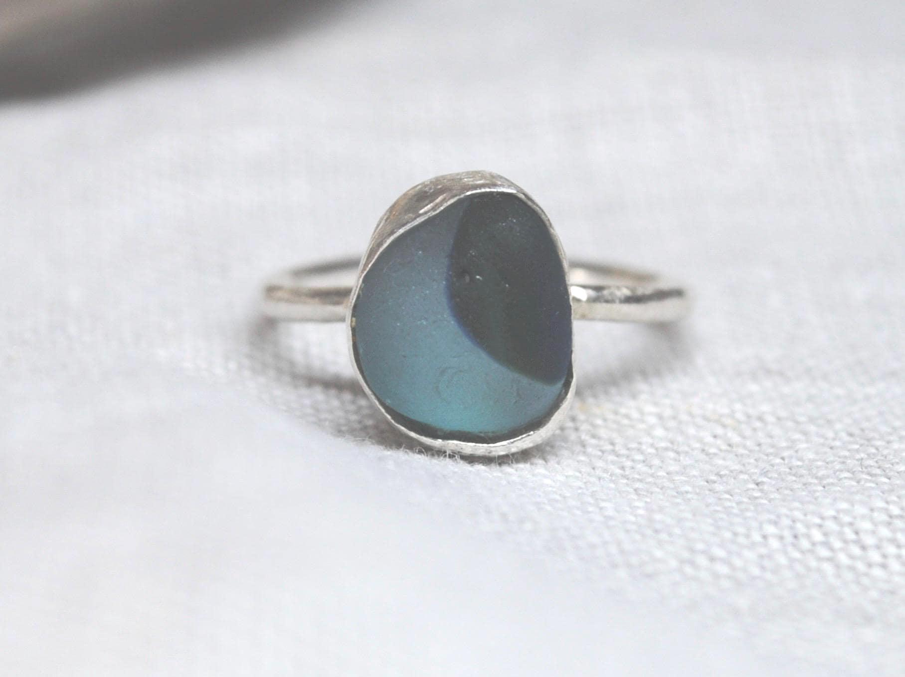 Absolutely stunning ring. The sea glass is a combination of pale aquamarine and deep steel blue, and its a perfect shape too! I was absolutely thrilled when I found this on the beautiful Northumberland coast line. The sea glass is wrapped in, and set on a simple sterling silver band - handcrafted with care in my little studio.